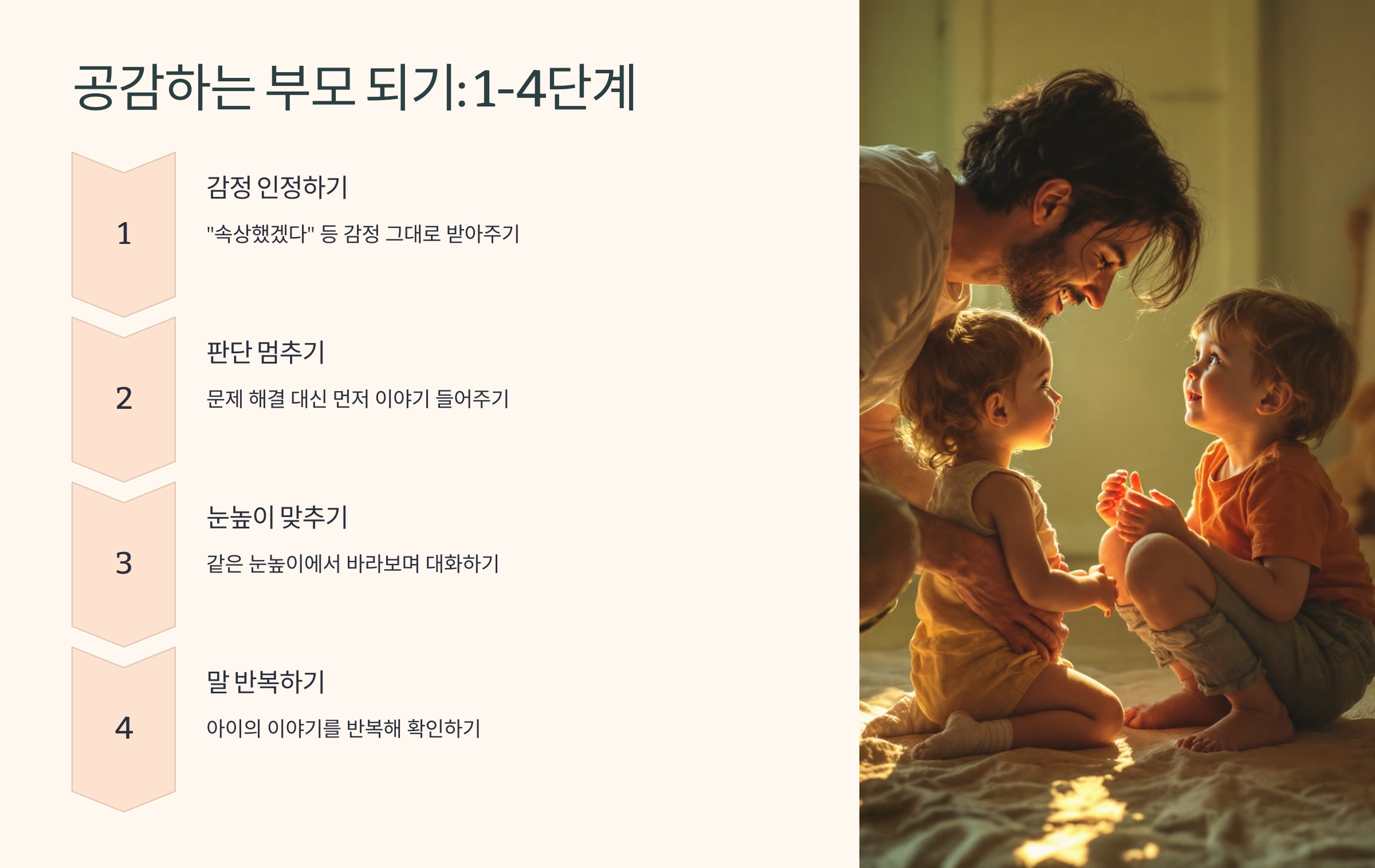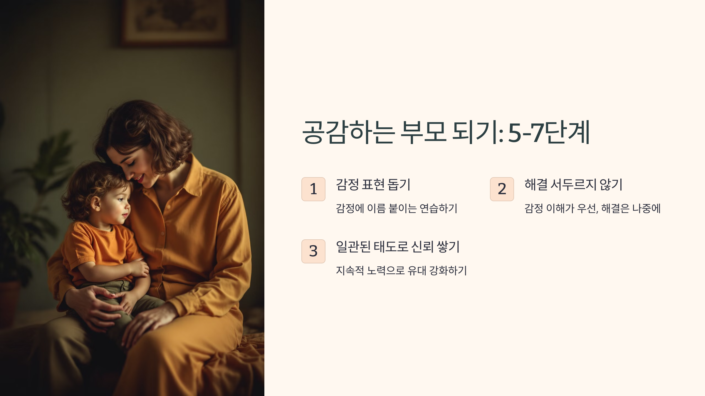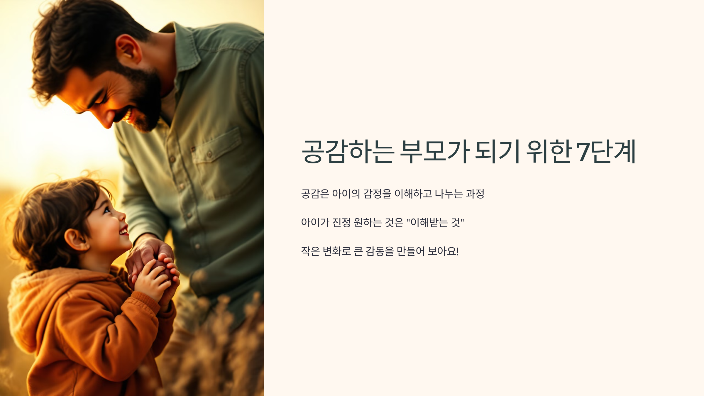 저도 처음엔 아이가 울거나 속상해할 때 문제를 해결하려고만 했었어요. 그런데 공감의 기술을 배우고 나서야 아이가 진정 원하는 것은 "이해받는 것"이라는 걸 알게 되었어요. 이번 글에서는 공감하는 부모가 되기 위한 7단계를 소개해 드릴게요. 작은 변화로 큰 감동을 만들어 보아요! 🌟