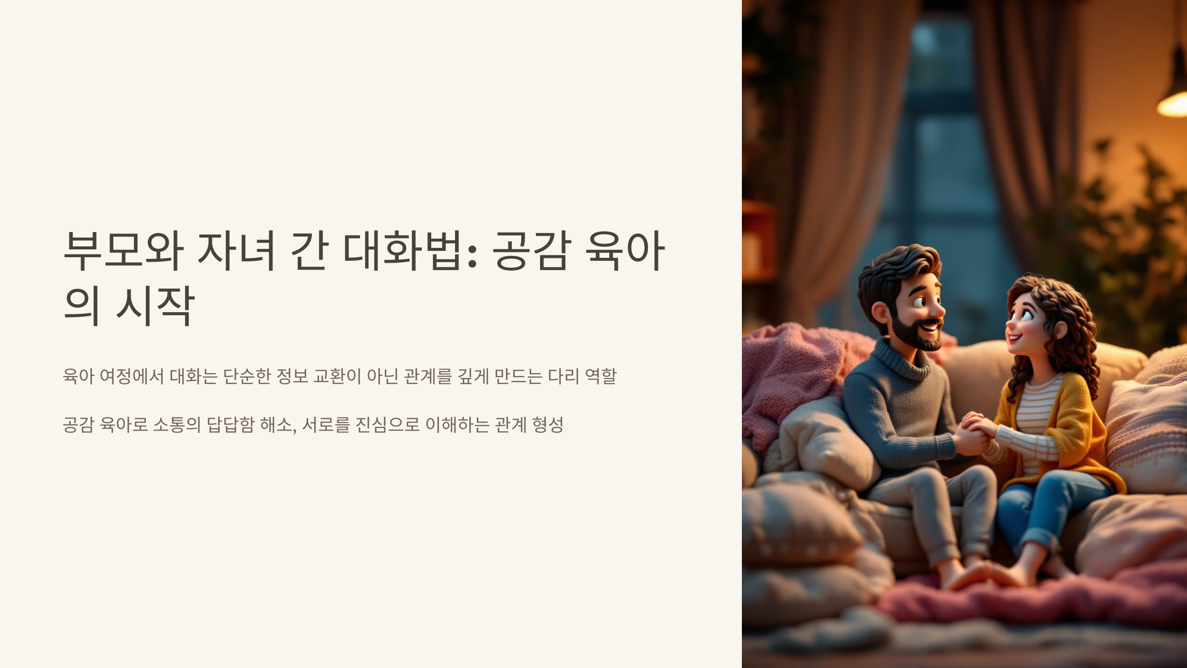 부모와 자녀 간의 대화는 단순히 문제를 해결하기 위한 도구가 아니라, 서로의 마음을 연결하는 가장 강력한 수단입니다. 공감 육아는 거창한 기술이 아니라, 작은 순간마다 아이의 감정을 이해하고 존중하는 데서 시작됩니다.