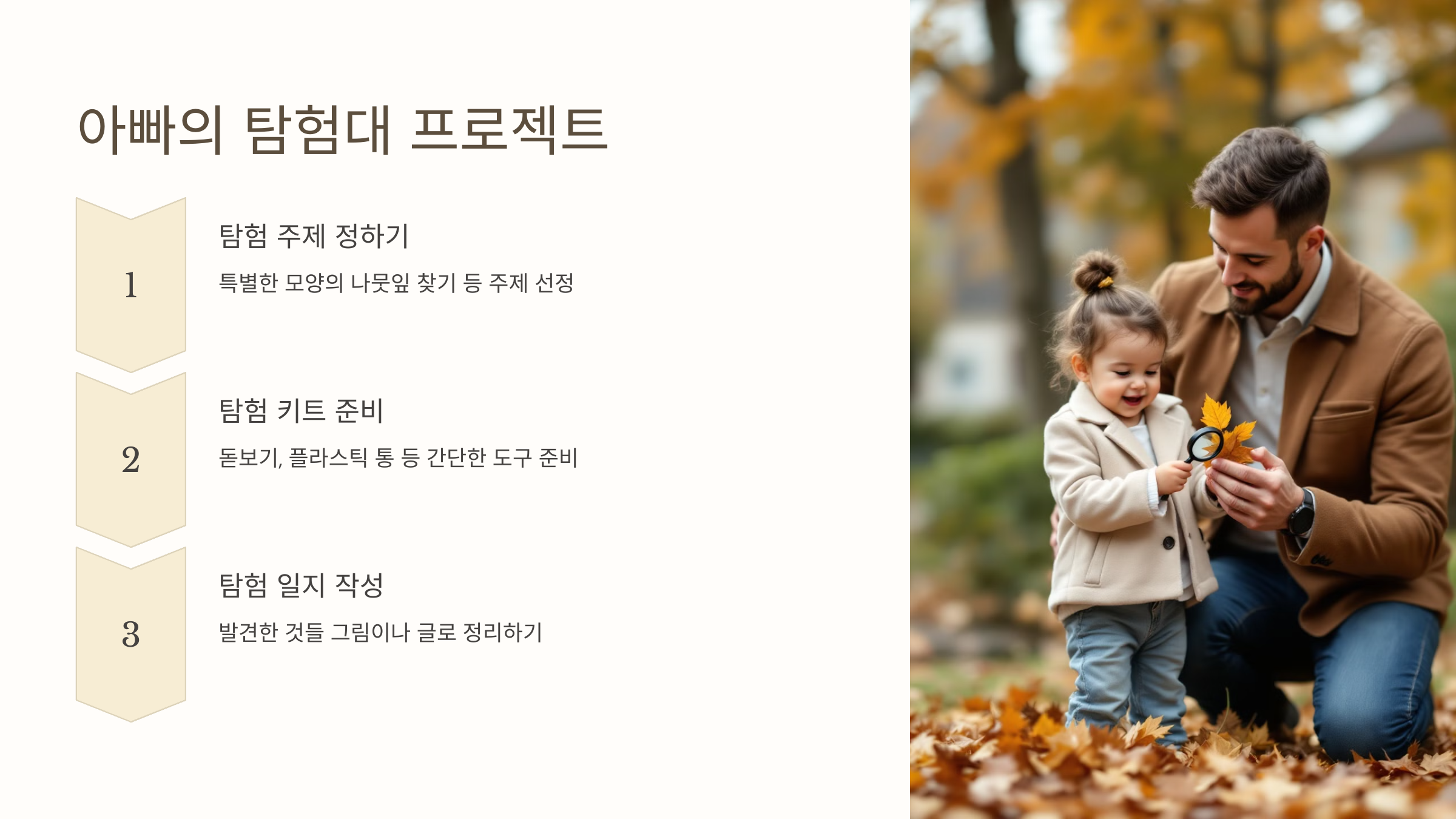 이번 주말엔 어떤 특별한 시간을 만들어볼까요? 아빠와 아이만의 "작은 챌린지"를 시작해보세요. 아마 생각보다 더 큰 웃음과 추억을 얻게 될 거예요. 🎉