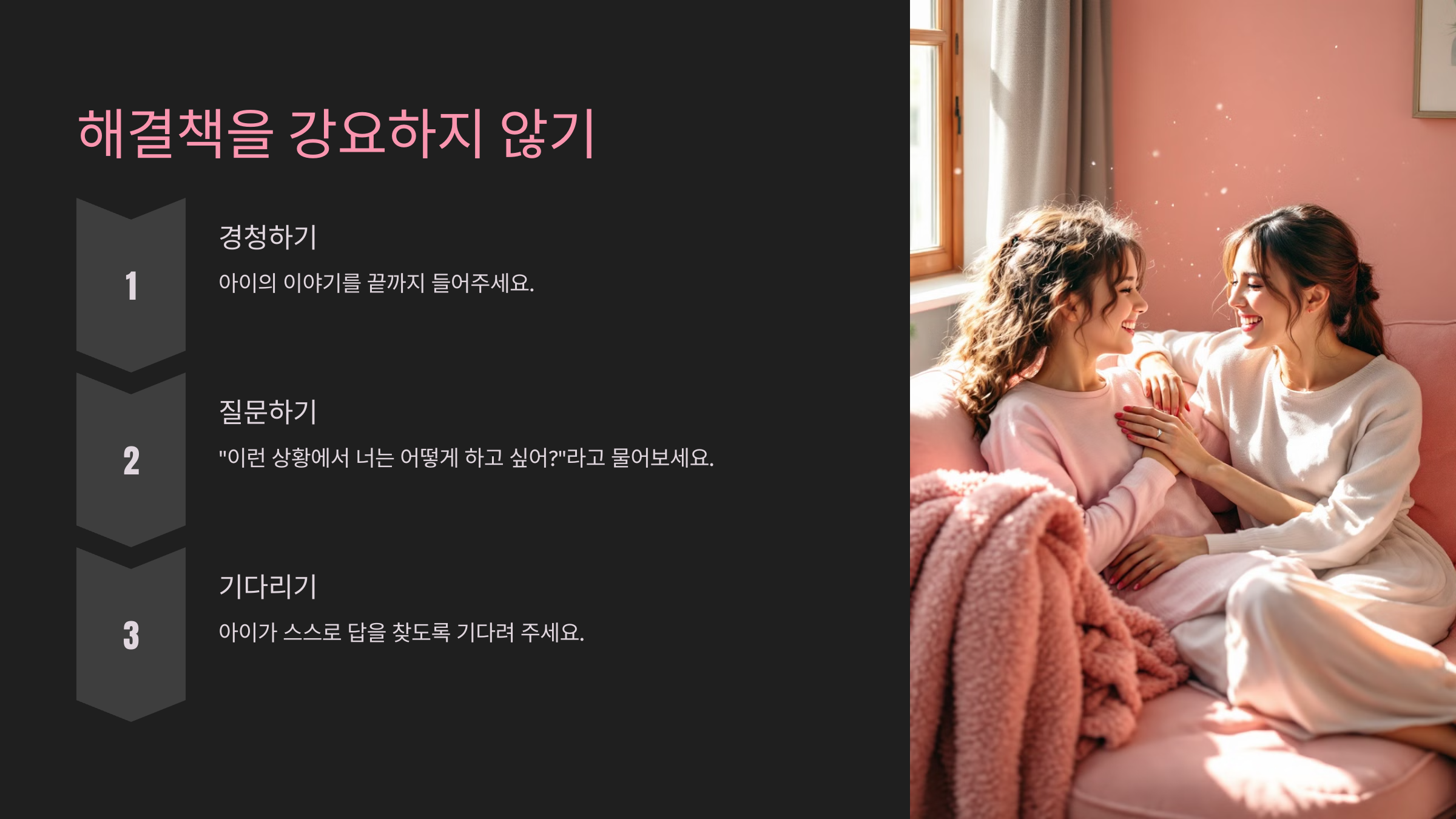 부모로서 아이의 어려움을 바로 해결해 주고 싶은 마음이 크죠. 하지만 때로는 해결책을 제시하기보다 그냥 들어주는 것이 더 필요할 때가 있습니다.