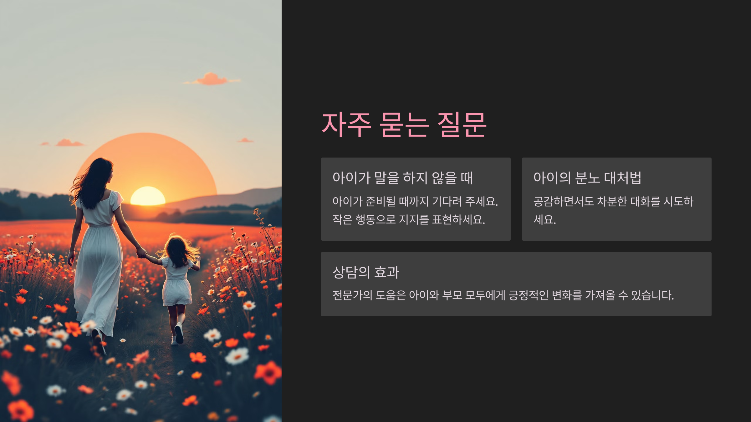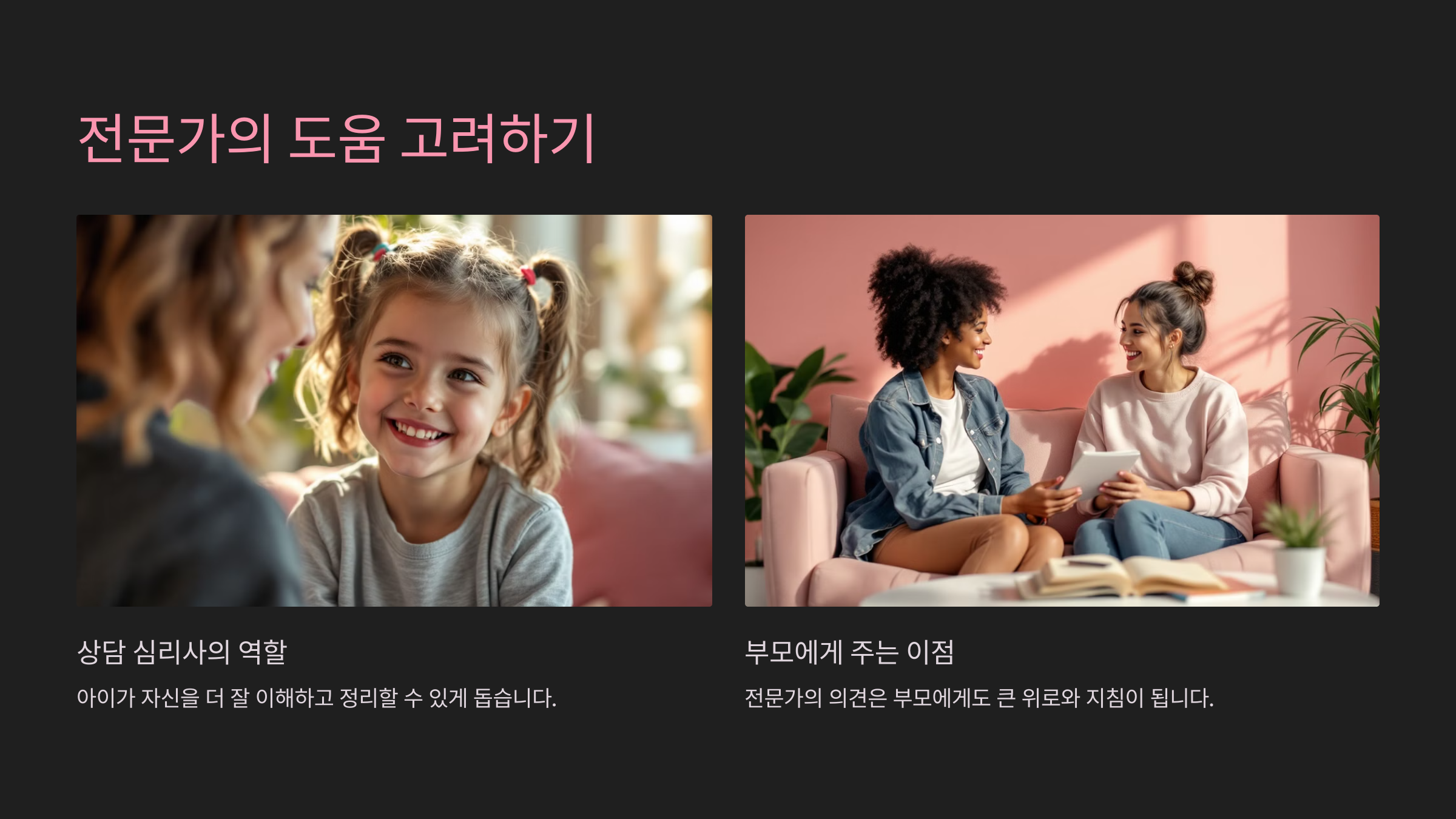 ✅ 전문가의 도움은 아이와 부모 모두에게 긍정적인 변화를 가져올 수 있습니다. 아이가 편안한 환경에서 자신의 감정을 표현하도록 돕고, 부모에게도 효과적인 대처 방법을 제공합니다.