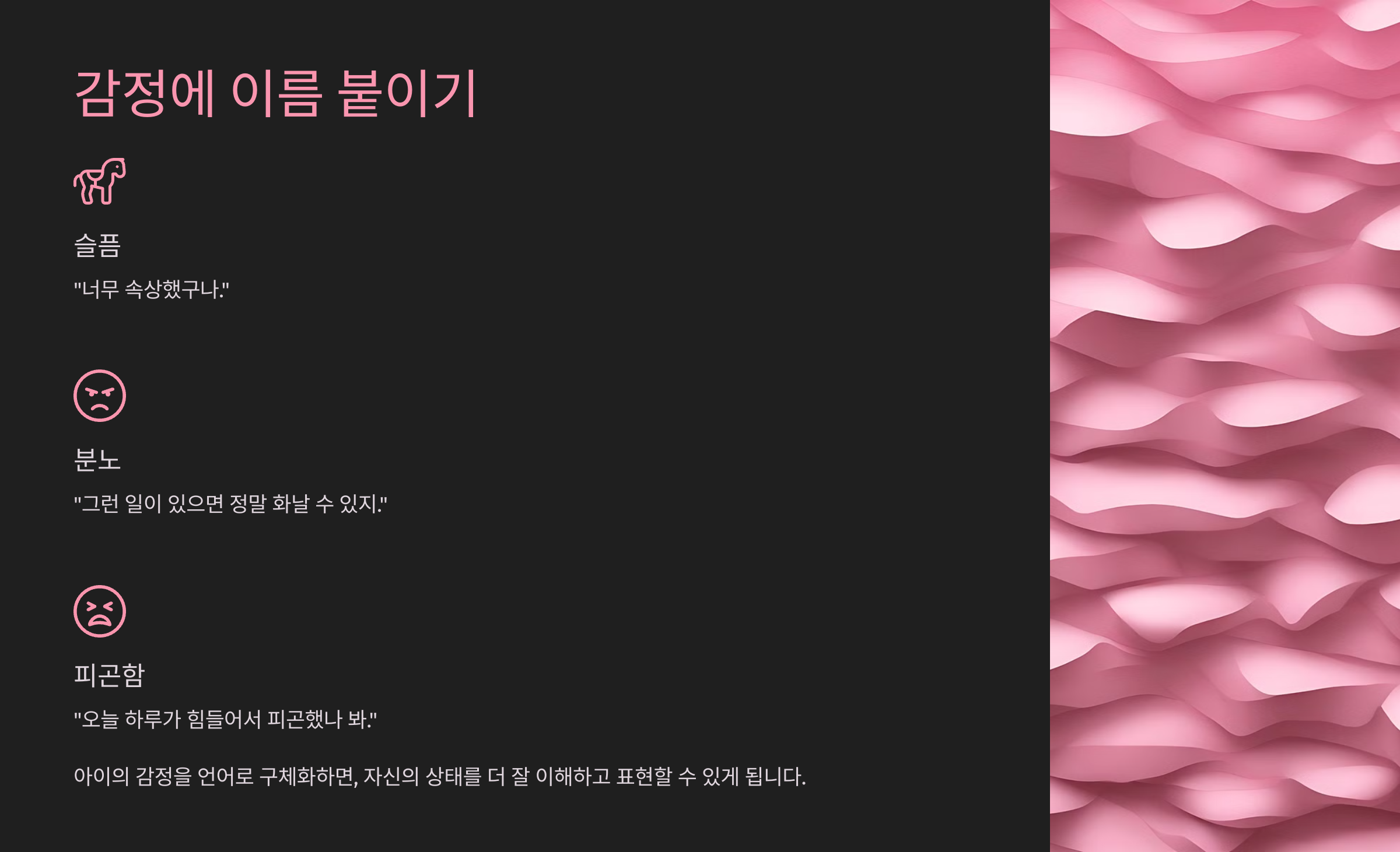 이렇게 아이의 감정을 언어로 구체화하면, 아이가 자신의 상태를 더 잘 이해하고 표현할 수 있게 돼요. 이는 문제를 해결하는 데도 큰 도움이 됩니다.
