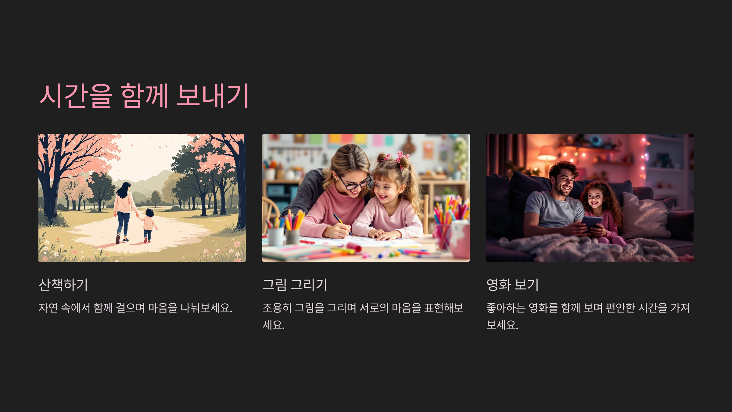 - 산책을 하거나, 조용히 그림을 그리고, 좋아하는 영화를 함께 보는 것만으로도 아이는 위로를 받을 수 있습니다.
