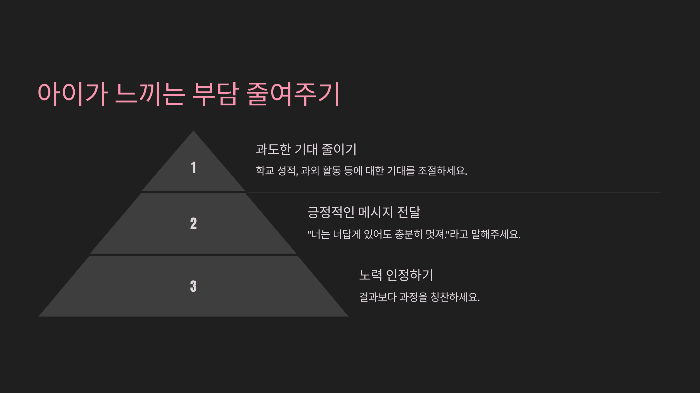 ✅ 부모가 기대를 줄이는 것은 결코 나쁜 것이 아닙니다. 아이에게 "너는 있는 그대로 소중해"라는 메시지를 전달하는 것이 우선입니다.