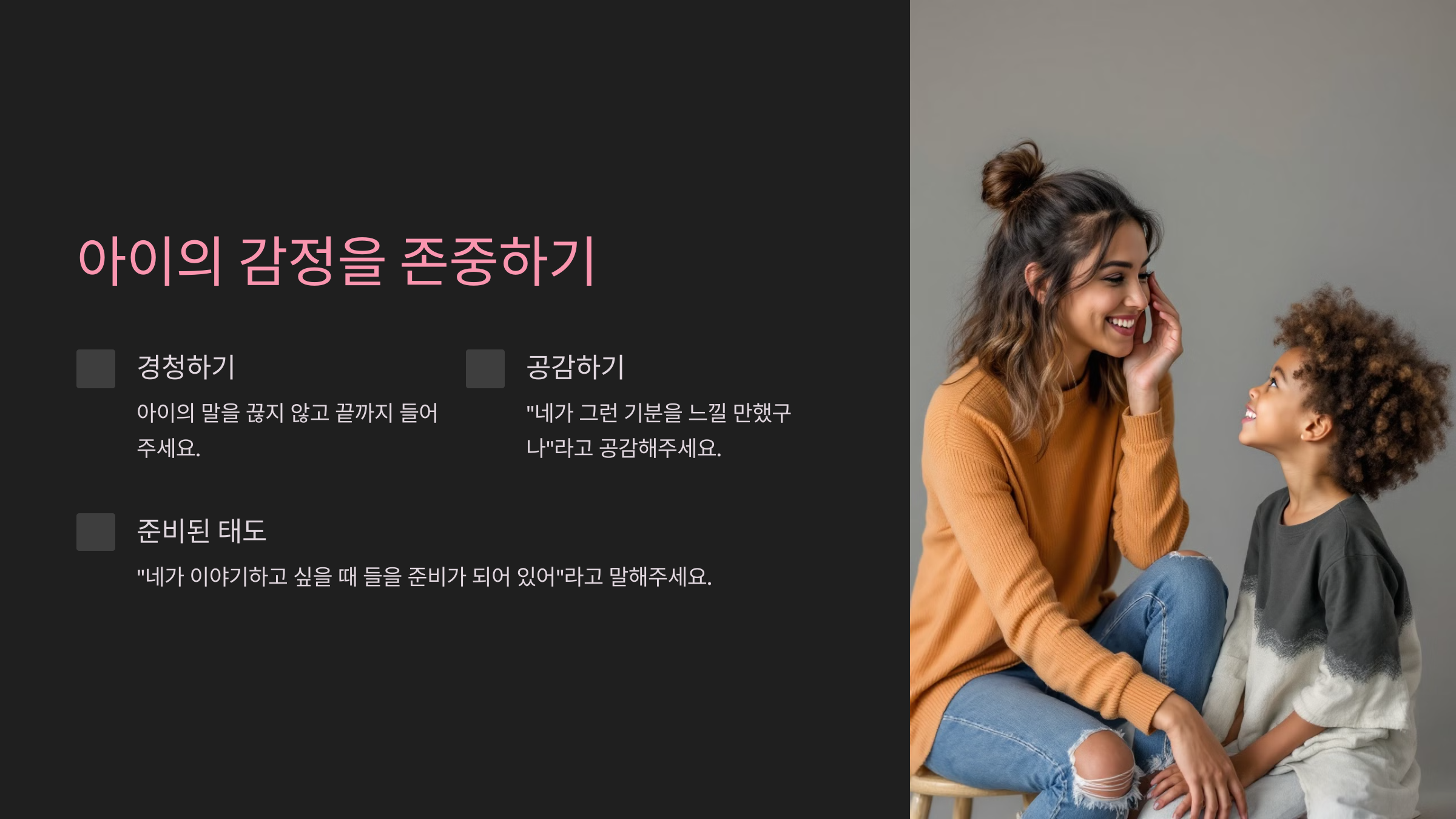 아이의 감정을 존중하는 첫걸음은 경청입니다.