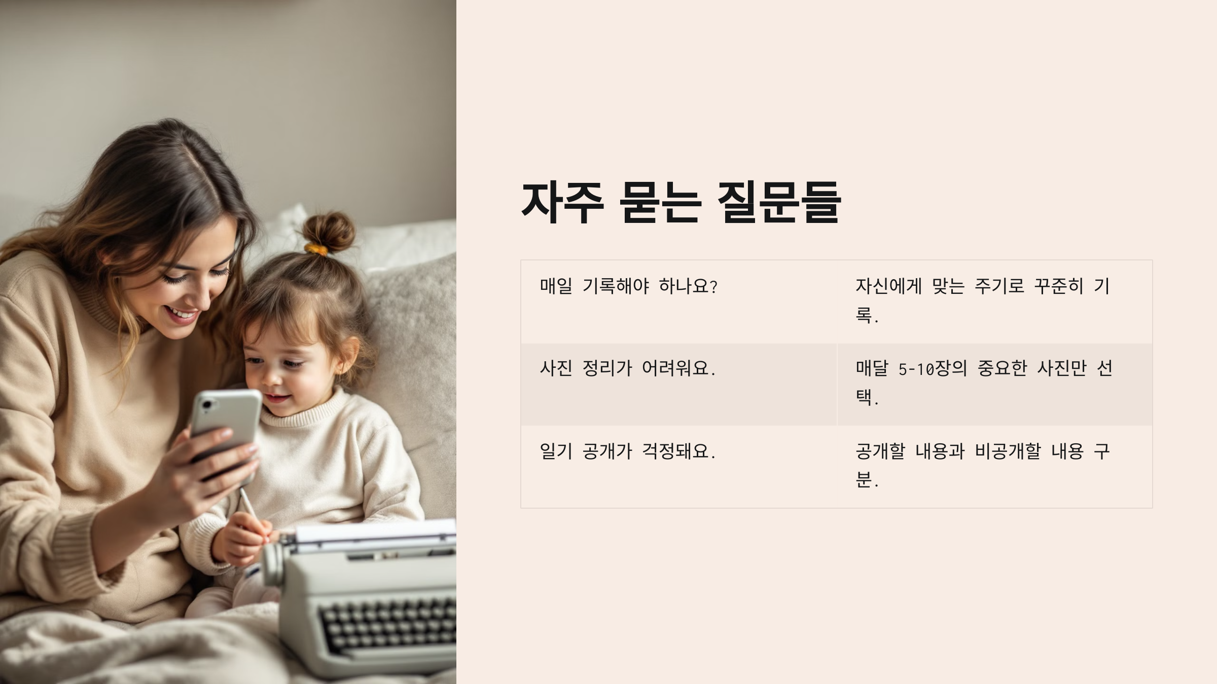 사진은 순간을 남기기 좋지만, 아이와의 대화나 일상 속에서 느꼈던 감정은 사진만으로는 기록하기 어려워요. 그래서 저는 엄마의 일기를 통해 아이의 말과 행동, 그리고 그때의 감정을 기록하기 시작했어요. 몇 가지 간단한 규칙을 정하고 나니 꾸준히 쓰는 것도 쉬워졌어요.