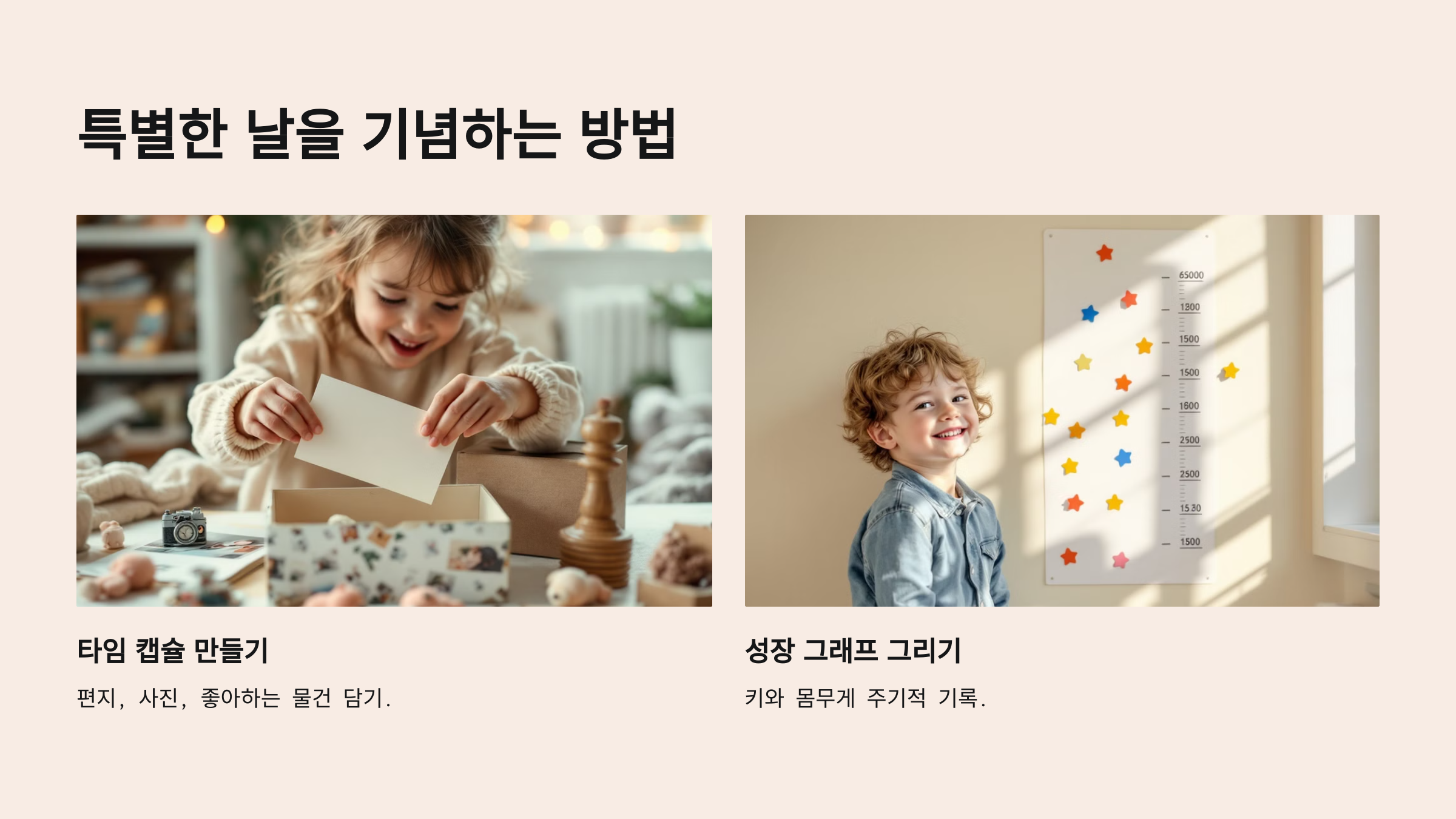 아이와 함께 타임 캡슐을 만들어 보는 것도 좋은 방법이에요. 편지, 그날 찍은 사진, 아이가 좋아하는 물건(예: 그림, 장난감)을 담아두고 몇 년 후 열어보세요. 큰 즐거움과 감동을 느낄 수 있을 거예요.