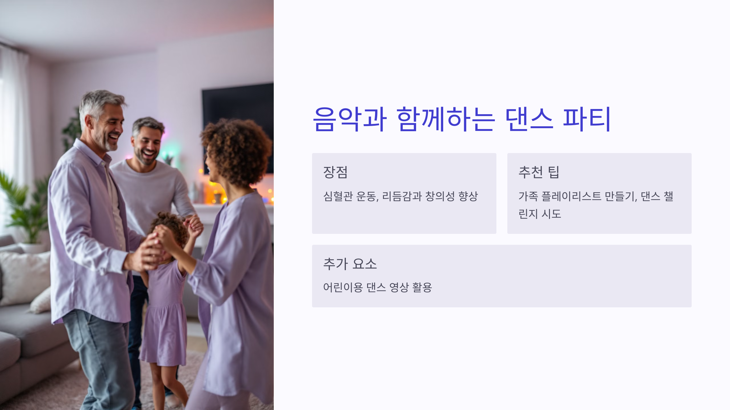 - 장점: 댄스는 심혈관 운동에 좋고, 리듬감과 창의성을 길러줍니다.