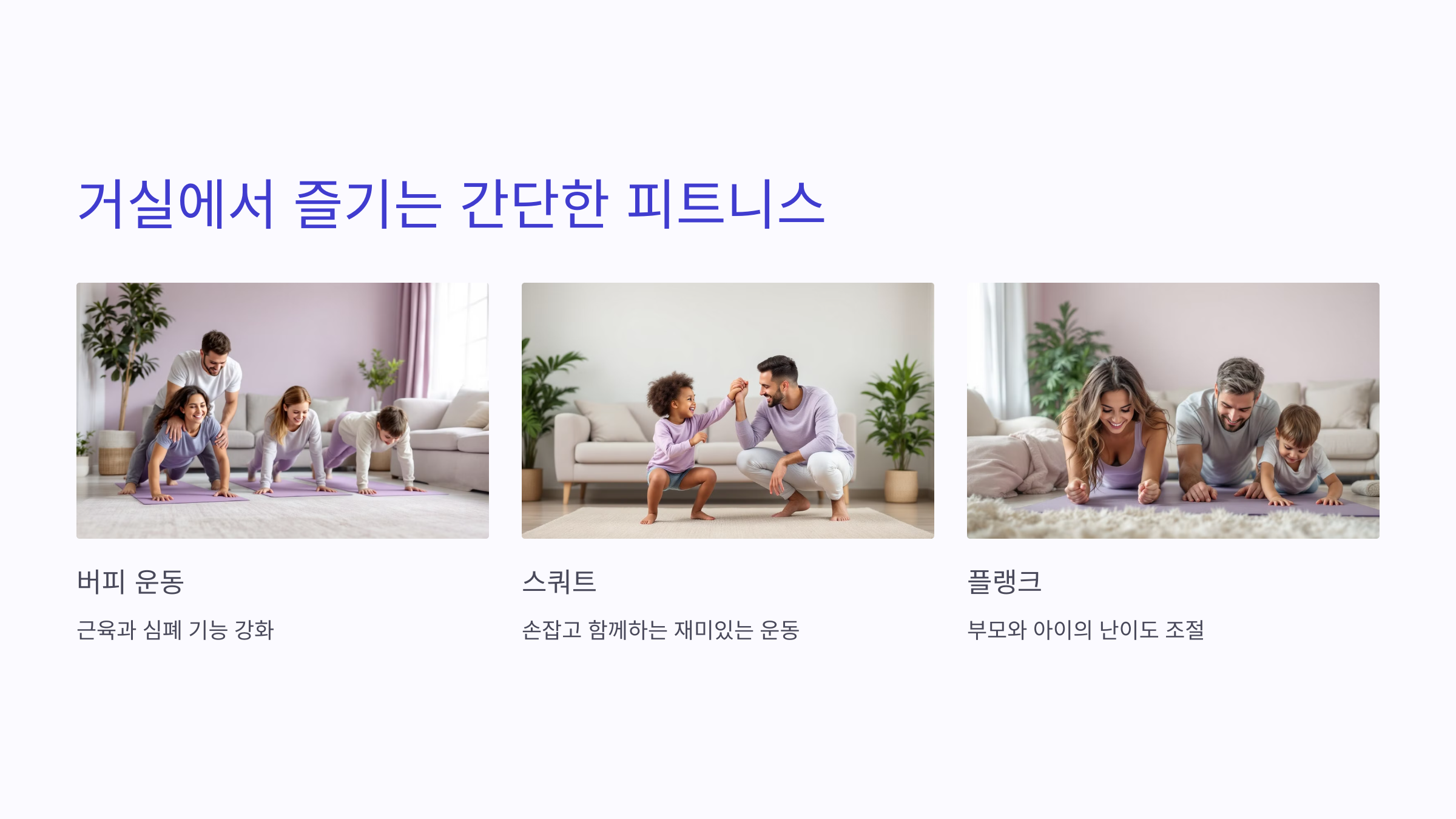 아이들과 함께 땀 흘리며 보낸 시간은 평생 잊지 못할 추억이 될 거예요. 그러니 오늘 바로 실내 운동 프로그램을 시작해 보세요!